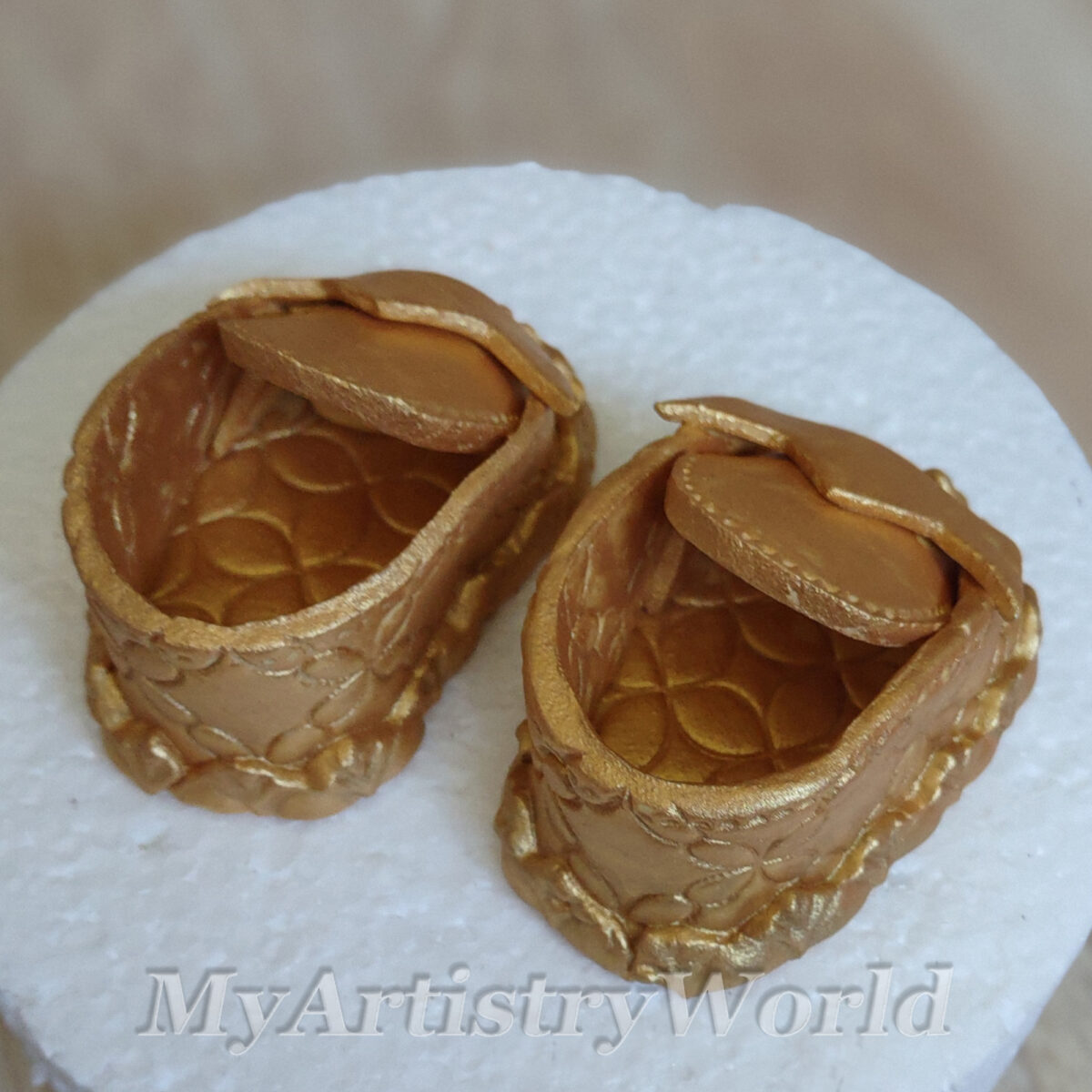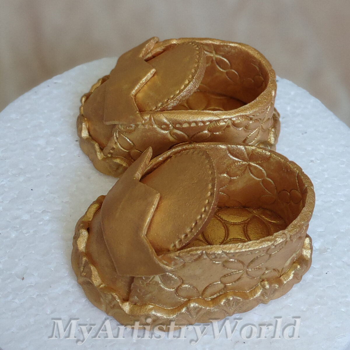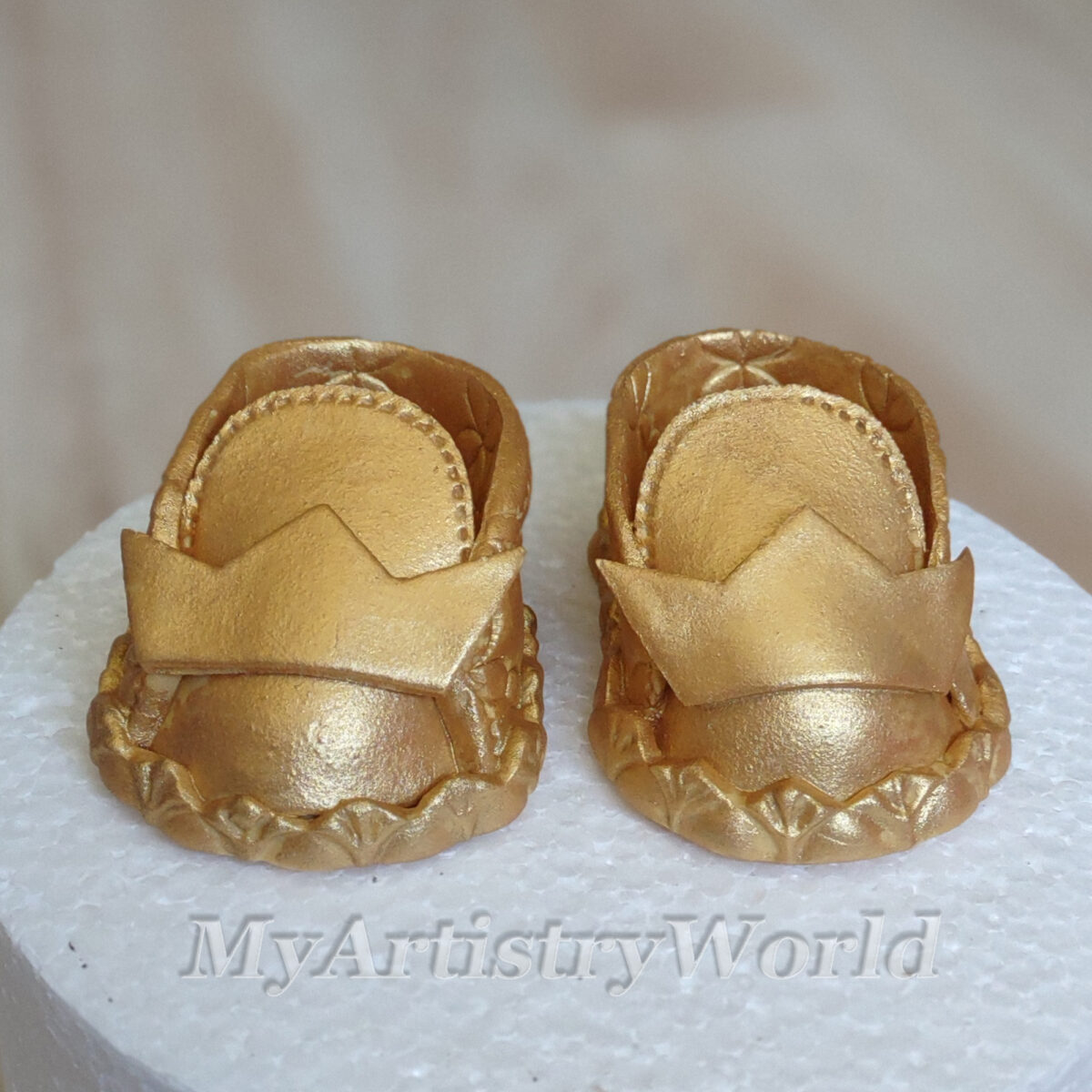 Edible 3D fondant/gum paste Gold Baby Booties cake toppers.