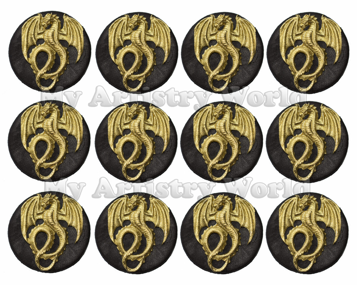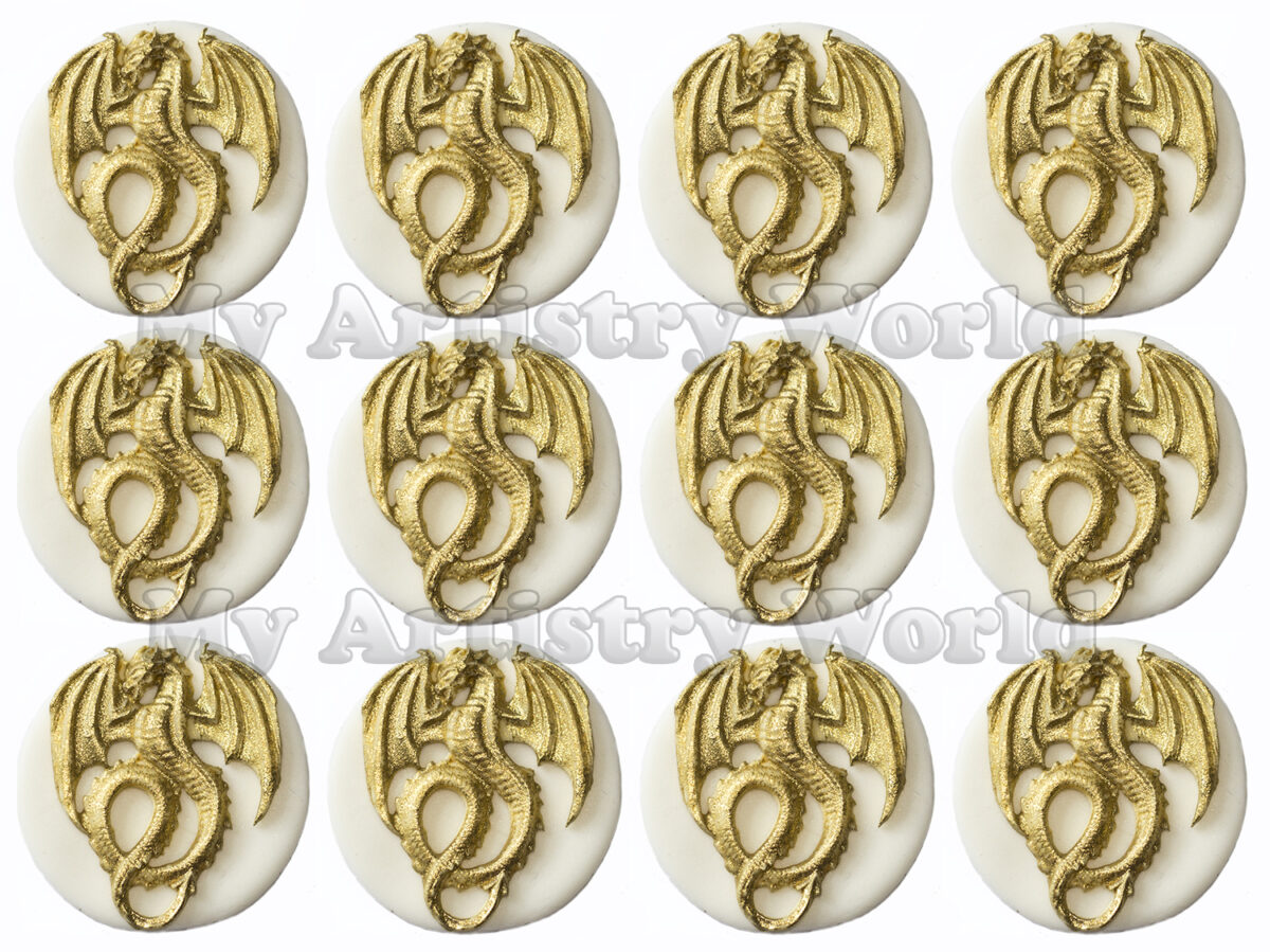 A set of twelve edible gold dragon cupcake toppers.