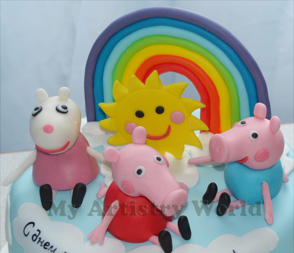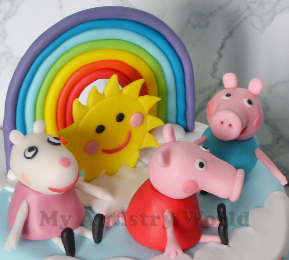 The listing above includes three Peppa Pig characters, a rainbow and a sun cake toppers. The pigs are approximately 3″ in height each. We can customize them to your liking. In case you would like them to be customized, please contact us first.