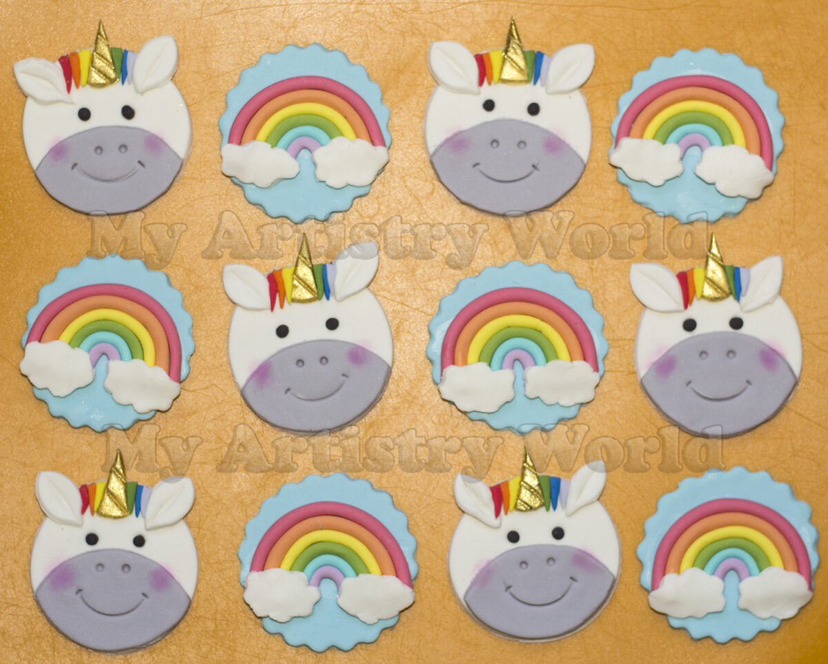 The listing above includes 12 fondant cupcake toppers, six of unicorns and six of rainbows.
